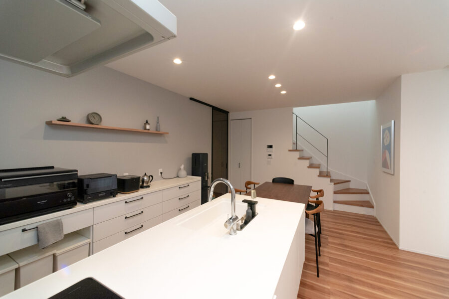 奥様お気に入りの白いキッチンは「毎日磨くのが楽しみ」とのこと。食洗器や乾燥機、室内干しの導入により、家事の負担も軽くなったと喜んでいただきました。