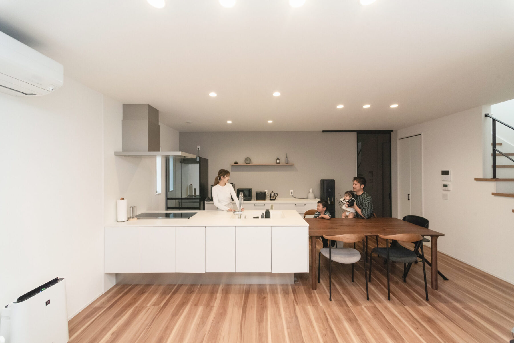 ご主人の地元に完成した白を基調としたナチュラルな新居で、ご家族4人の賑やかな暮らしが始まっています。